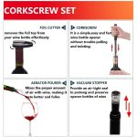 Ovaj 4-u-1 set uključuje otvarač s pumpom na zrak, rezač folije, aerator i vakuumski čep za besprijekorno vinsko iskustvo.
